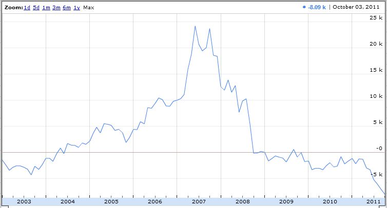 Assuming that the number of shares owned of Nissan Motors has been unchanged over the years, and the number of shares outstanding of Renault has been stable over the years (a quick look at the annual reports seem to confirm this), then this figure (Renault’s market capitalization minus market value of Renault’s ownership in Nissan stock) historically has looked like this: