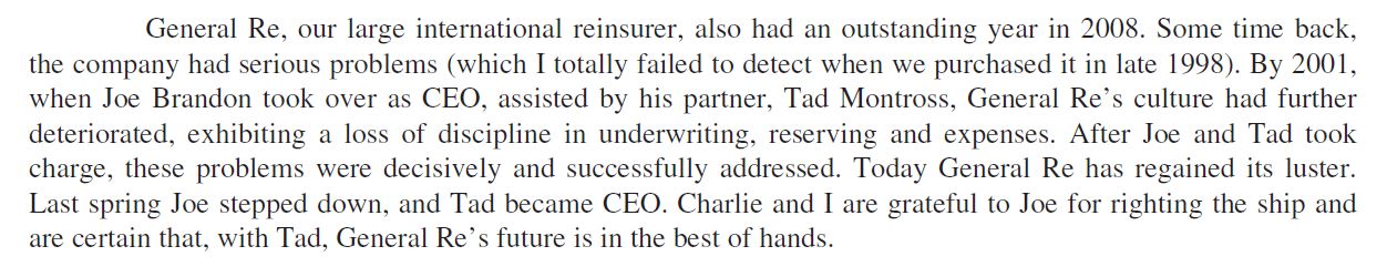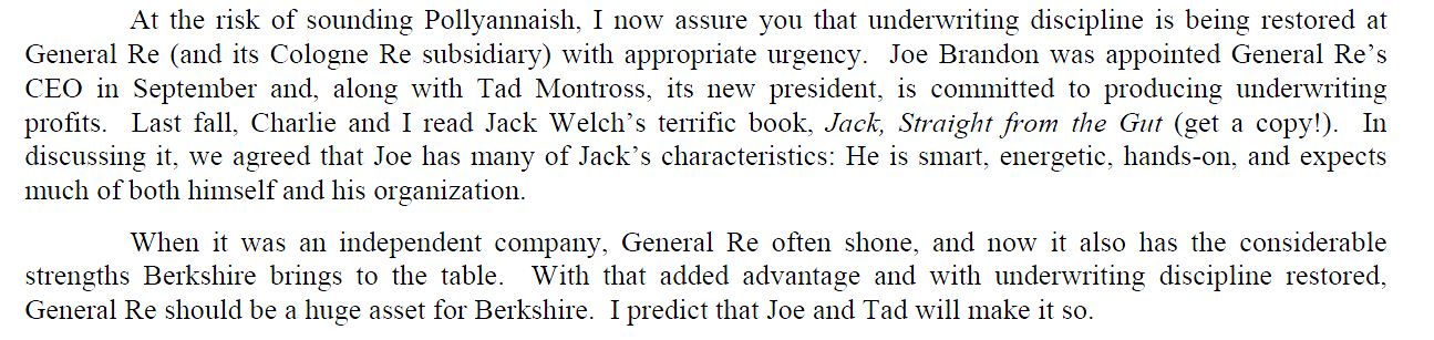 Here is Buffett on Brandon in the 2007 annual report, six years after Brandon took over Gen Re: