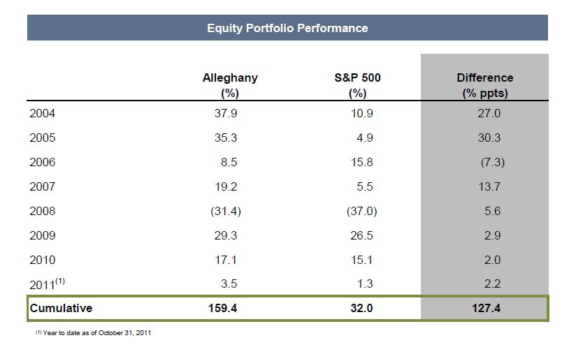 This is the combined ratio of Alleghany’s insurance business compared to peers. This shows that they are good underwriters and do walk the talk.