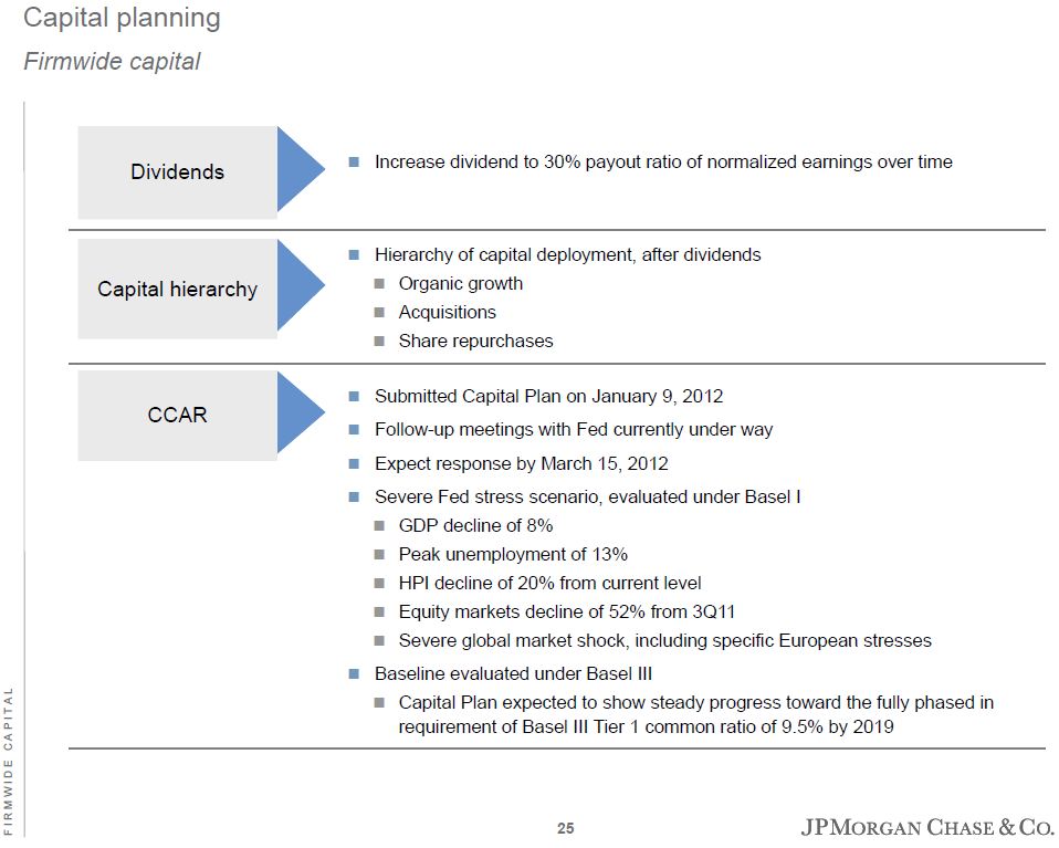 Anyway, the other issue with the banks is the stress test. It’s amazing how well prepared JPM was for the last real crisis and they have always been ready for them. So this stress test should be easy for JPM. It is encouraging that even with the above stress test scenario of housing prices going down another 20%, unemployment rate going up to 13%, GDP going down 8% and stock prices going down 50% from their 3Q2011 lows that JPM will have no problem getting through it.