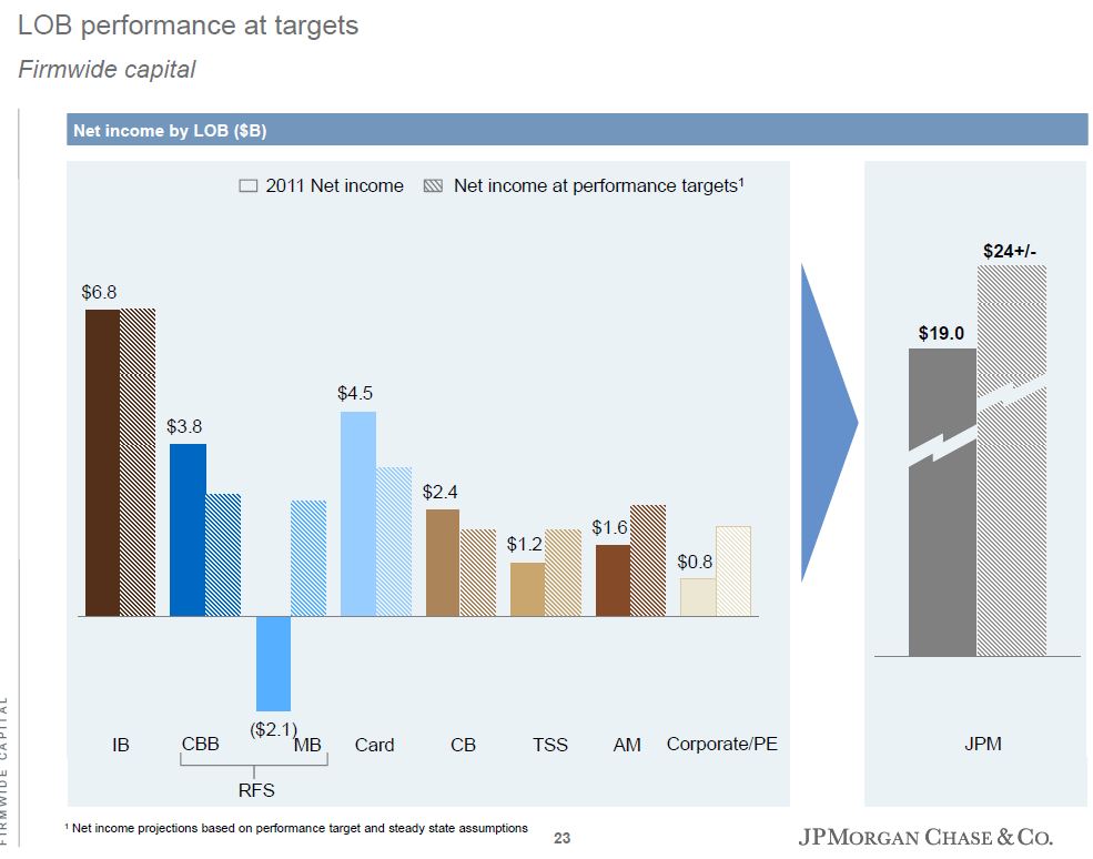 The following bridge, or walk or whatever you want to call it is how JPM can get to $24 billion net income. It includes the normalization of high credit charge offs, mortgage related expenses and things like that but doesn’t include any robust recovery in the economy or any such thing. Growth inititiaves only add 4% or so.