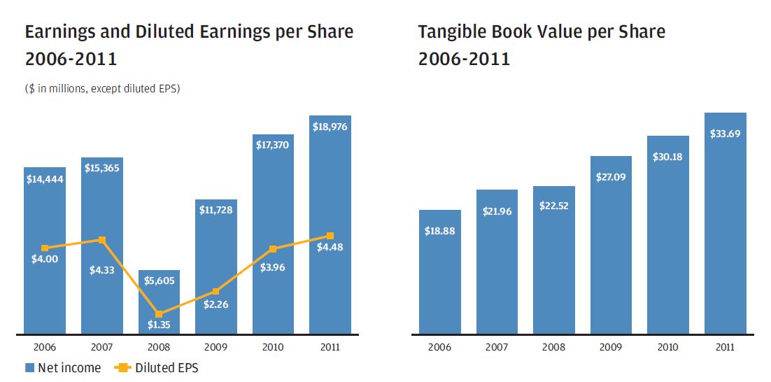 So in the worst economic environment since the great depression, JPM managed to make money throughout and has even increased tangible book value per share by more than 12%/year in this turbulent five year period.
