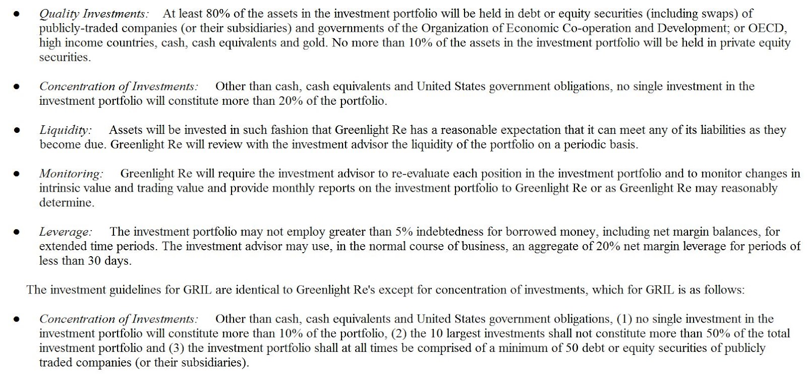 Also, I don’t know the investment guidelines in Einhorn’s hedge funds, but the investments at GLRE do have restrictions (if this is too small to read, just look it up in the 10-K):