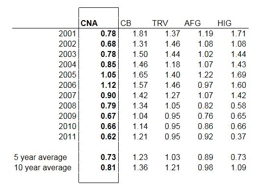 That’s what I was thinking initially, but a look at the long term history of CNA has made me wonder about that. It’s true that they are doing a little bit better in the past five years or so (despite the jawdropping decline in book in 2008) but improvements at CNA have been promised before.
