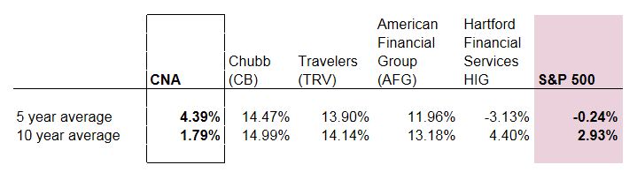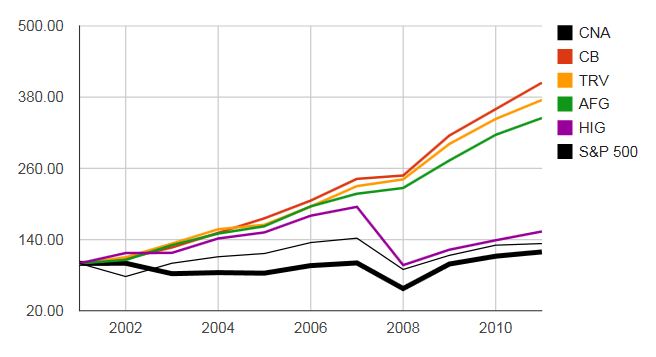 This is how other insurance companies have done over the past ten years compared to CNA. CNA is the dark, fat line at the bottom of the chart. You notice that CNA has done demonstrably worse than the other insurance companies and even underperformed the S&P 500 index (as we already saw earlier).