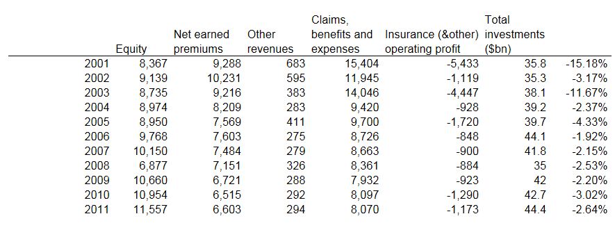 They have $2.2 billion in limited partnerships as of the end of 2011. I don’t think you can calculate the rate of return on these funds as we don’t know the cash inflow/redemptions from these funds. All we know for sure is the investment income that comes from the partnerships, and that is listed in the table above. That comes to an average of 7.5% since 2001, but that probably understates the actual return. In 2011, there was $560 million in undistributed earnings included in the $2.2 billion figure above. I suppose you can calculate the change in undistributed earnings, but that isn’t disclosed going that far back.