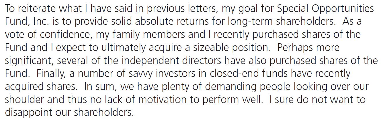 - Great letters to shareholders. When was the last time you read a letter to closed-end fund investors? Of course, why would anyone. They are horrible. Goldstein’s letters for SPE are really good. They offer clear thoughts on what they are trying to do and specific ideas with some details on them. This is exactly what you want from a manager of your money. Most fund letters seem to be so focused on blaming and excuses; “The Euro crisis worsened during the period and our exposure to cyclicals caused our severe underperformance versus our benchmarks but it’s not really our fault so don’t blame us! It’s Bernanke’s fault! It’s Merkel’s fault!”