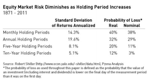 Pzena talks about how people measure risk with volatility, Sharpe ratios and other things that measure price movements over the short term. But as we know, stocks are less risky over the longer term. Here is how he illustrates the benefit of holdings stocks for the longer term: