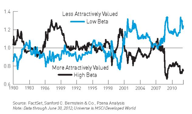 The valuation gap between low beta and high beta stocks is as high as ever. This sort of value differential is a great opportunity for deep value investors. Stock investors seem to be rushing to safety; low beta, high yield stocks, consumer staples etc. while running from the cyclical, high beta names. Of course this includes financials (and we all know financials are cheap).