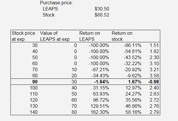 Of course, leverage is a double-edge sword so you lose a lot more on the downside too. If the stock goes down 10%, the LEAPS value goes down more than 30%. If the stock goes down to $70, the stockholder loses only 21% but a LEAPS holder loses 67%.