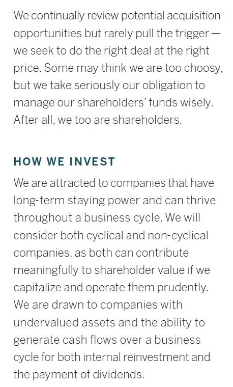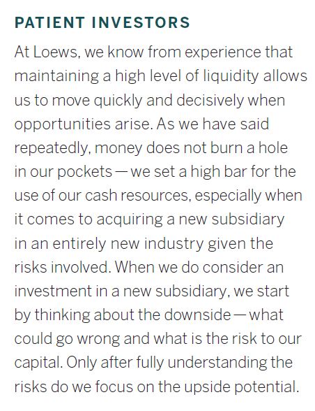 They explain their approach to investing. I think investors are antsy that L is sitting on so much cash; they wonder when they will do a big deal that might get the market excited about L. So this is their response to that, I suppose.