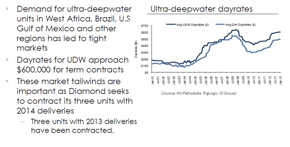 Contrary to what you would imagine, ultra-deepwater day rates are trending nicely, getting back up to the 2007-2008 highs. This is good for DO, of course, since they have some new rigs coming online soon.