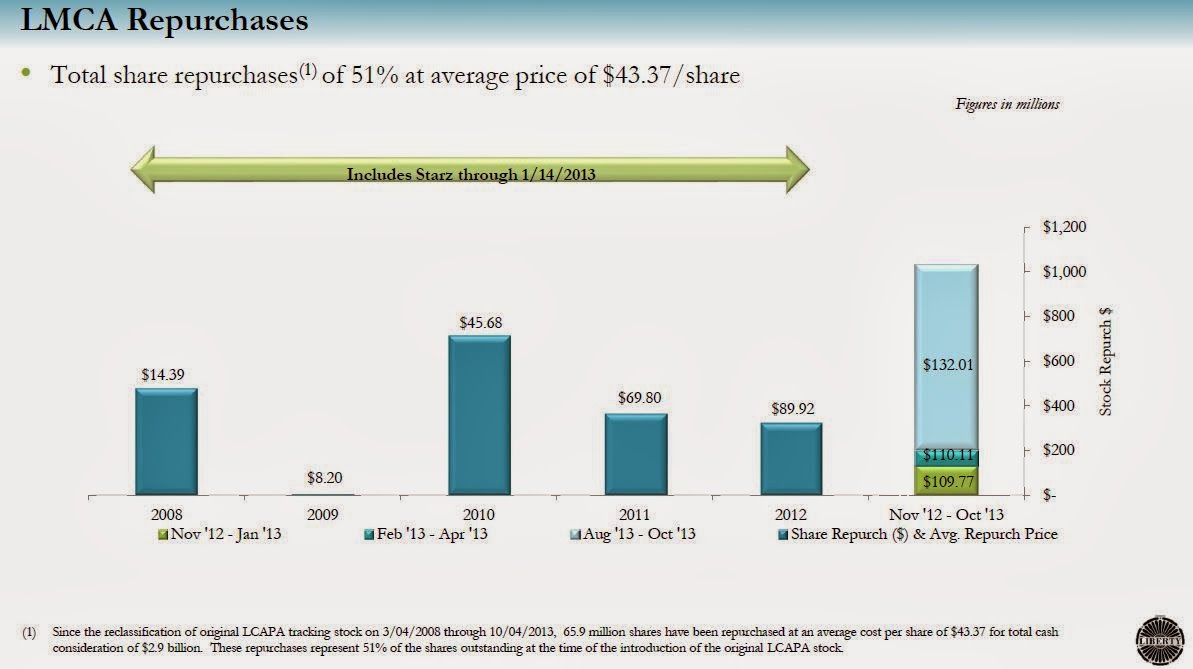 Slide 19 ("investment milestones since last meeting") says that 8.1 million shares were repurchased for $1 billion. That would imply an average price of $123.46, but LMCA says the average price was $127.02. The share repurchases began before the Starz spinoff and include the Comcast exchange. Not sure how those things would affect the calculation. Any idea how they arrived at that figure?
