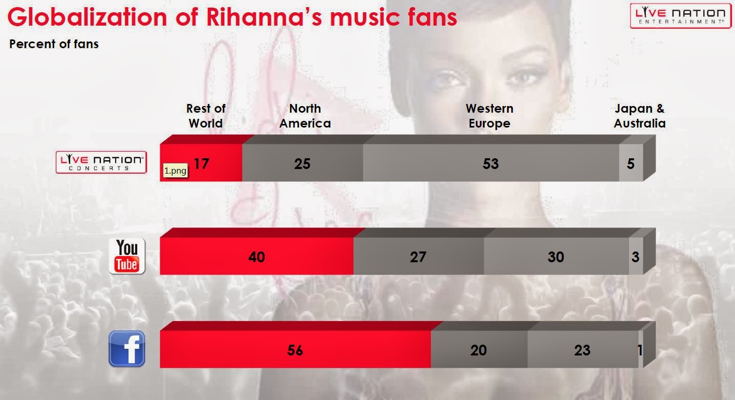 So we see that only 17% of the Rihanna concerts take place in the world excluding North America and Western Europe, but 56% of her fans on Facebook and 40% on Youtube are from this area.