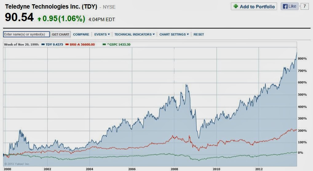 So I surfed around the internet and duh, I realize that Teledyne (TDY) is still a listed company. I figured TDY didn’t exist on it’s own and they were parts of other large corporations by now. But TDY merged with someone in 1996 but was spun out again in 1999 as Teledyne (along with other parts of the old Teledyne, Water Pik (PIK) and Alleghany Technologies (ATI). Water Pik was bought out by private equity and ATI is still listed (now I see why Joel Greenblatt was on the board of ATI; it must have been spin-off related). All of this stuff is in the book, by the way (the merger and the spinoff, and the chapter “Teledyne Renaissance” written by the then (at spin) and current CEO Dr. Robert Mehrabian).