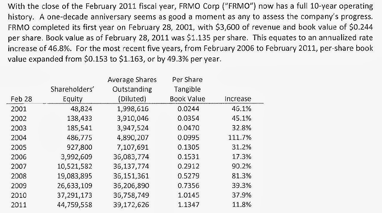 By the way, the structure of FRMO has been evolving and equity base is getting bigger so this may not be indicative of future potential, but check out the history of growth in per share value of FRMO over the years from their 2011 letter to shareholders (per share tangible BPS was $1.39 and $1.93 for 2012 and 2013):
