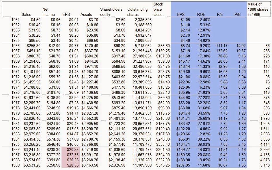 The purple/pink figures for the 1986-1989 EPS is calculated using the net income and shares outstanding as the EPS figures in the book look wrong. In the book, it shows EPS of $4.07, $6.45, $6.81 and $4.66 for that period which doesn’t make sense if the net income and shares outstanding are correct (and those look more in line with the rest of the data).