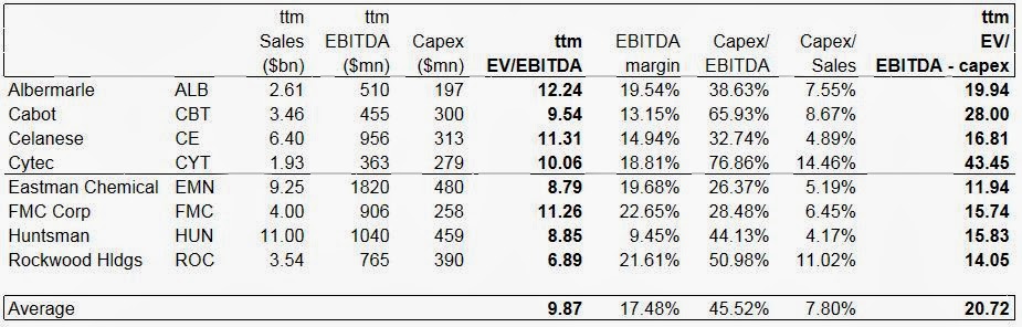 The MBO of MacDermid happened at around 9x EV/EBITDA. Since MacDermid was a publicly listed company, you can go to sec.gov and get 10-k’s and other filings including the MBO merger proxy from 2007. I was going to use that proxy for valuation, but there is a more recent proxy from the Solutia acquisition by Eastman in early 2012. There is probably a more recent acquisition/merger, but this is good enough for comparative transaction analysis. Since this is not a Conde Naste publication and I don’t have free interns working for me, I will do the comparative company analysis myself.